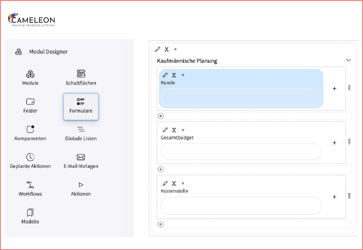 Gut strukturierte und übersichtliche Eingabemasken sind entscheidend für effiziente Prozesssteuerung. Der in Cameleon integrierte Form Designer bietet volle Flexibilität bei der Gestaltung von Formularen und Oberflächen. Eingabefelder können frei positioniert und dimensioniert werden, verschiedene Feldtypen stehen zur Auswahl, und externe Inhalte lassen sich nahtlos integrieren. Grafische Elemente erhöhen die Übersichtlichkeit und sorgen für eine klare, moderne Benutzerführung.