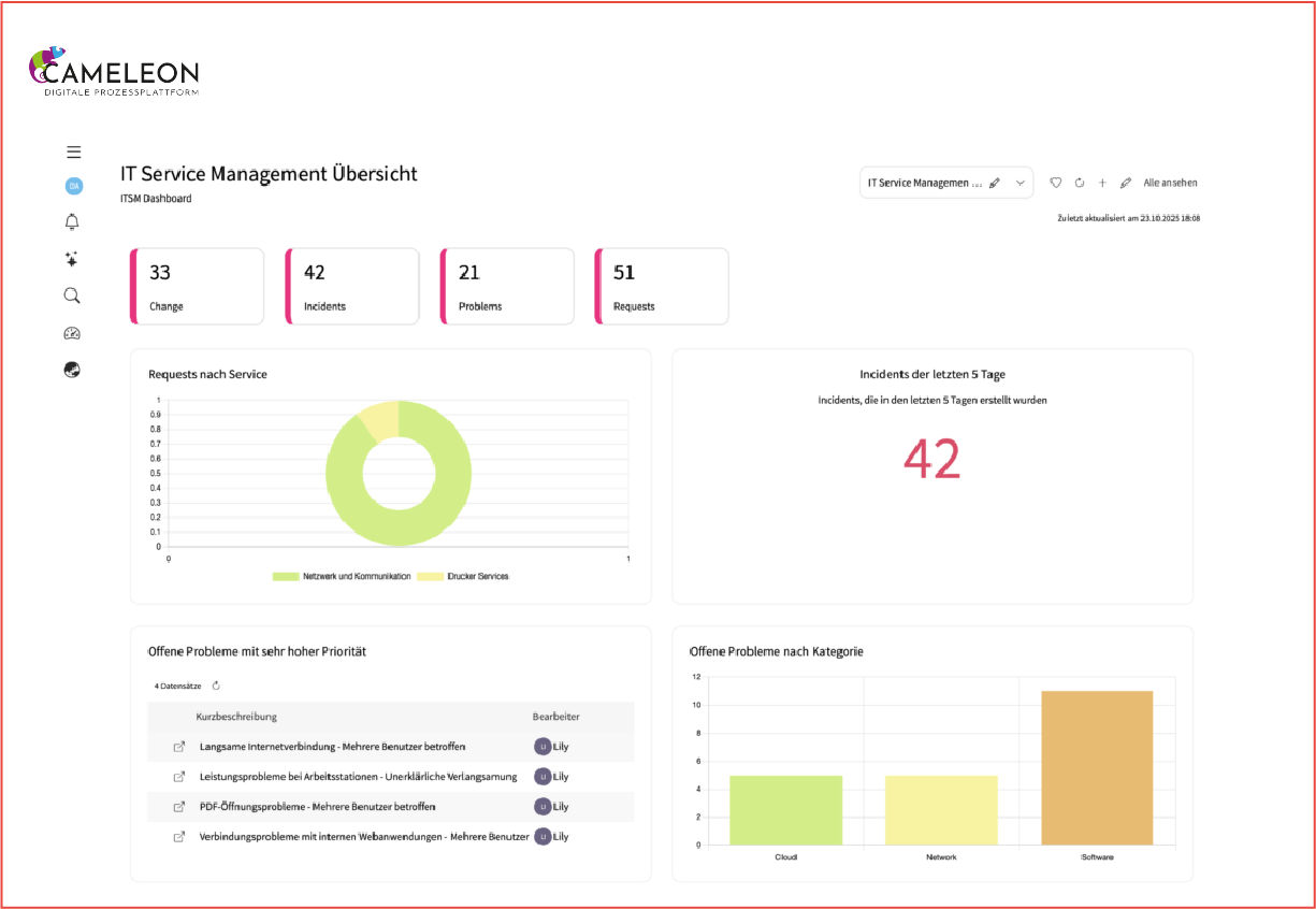 Cameleon ist eine universelle Plattform, entwickelt von einem Team aus Experten im Bereich ITSM-, ESM-, Projekt- und Asset Management. Wir haben Cameleon geschaffen, um Digitalisierungsprojekte zu beschleunigen und eine leistungsstarke, flexible Lösung anzubieten, die sich nahtlos an Ihre individuellen Bedürfnisse anpasst. Unsere Plattform ist eine Synthese aus Effizienz, Wirtschaftlichkeit und Benutzerfreundlichkeit, die Ihre tägliche Arbeit vereinfachen wird.