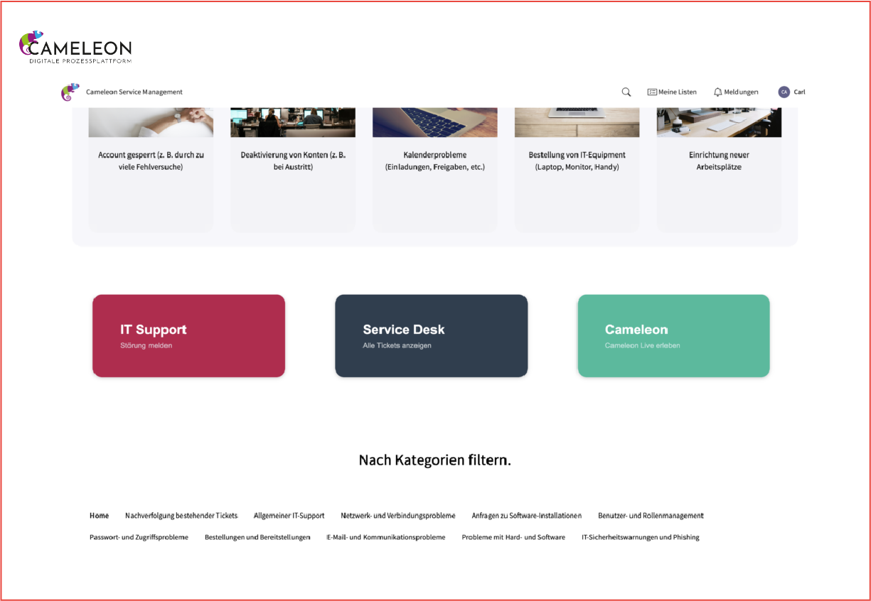 Die Plattform bietet ein leistungsstarkes, individuell anpassbares Self-Service-Portal für Endanwender. Über das Portal können alle in Cameleon hinterlegten Prozesse gestartet, der aktuelle Bearbeitungsstatus eingesehen und direkt mit den zuständigen Teams interagiert werden.
