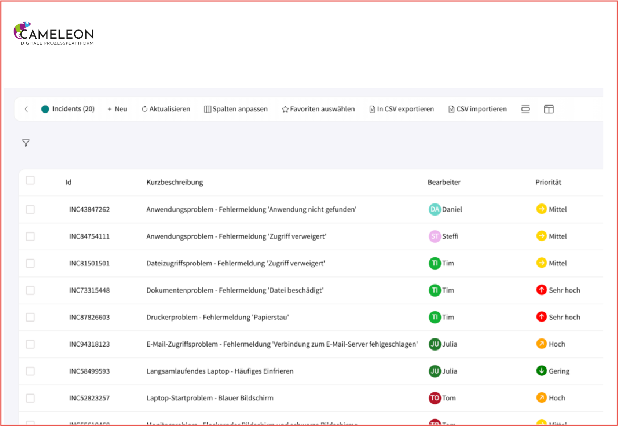Ganz gleich, ob Sie mit den vorgefertigten IT-Service, IT-Asset, Enterprise Service Management- oder der Plattform und Ihren eigenen Prozessen starten wollen – Cameleon ist direkt einsatzbereit und bietet darüber hinaus eine Vielzahl an Schnittstellen zur schnellen Übernahme wichtiger Basisdaten, damit Ihre Prozesse einfach so digital werden.
